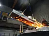 Et prøvestykke som simulerer et massivtre-element løftes av fra ovnen etter avsluttet test hos RISE Fire Research i Trondheim. FIRENWOOD-prosjektet har gjort til sammen over 2.000 små- og storskala eksperimenter med ulike typer lim.