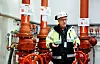 Kontroll av ytelsen til anlegget må de derimot ha hjelp av Elton til å gjøre. Da prøves både startsystem og alarmer, samtidig som vannforsyningen og pumpene belastes opp til den vannmengden som anlegget krever. I dette tilfellet opp mot 6000 liter per minutt.